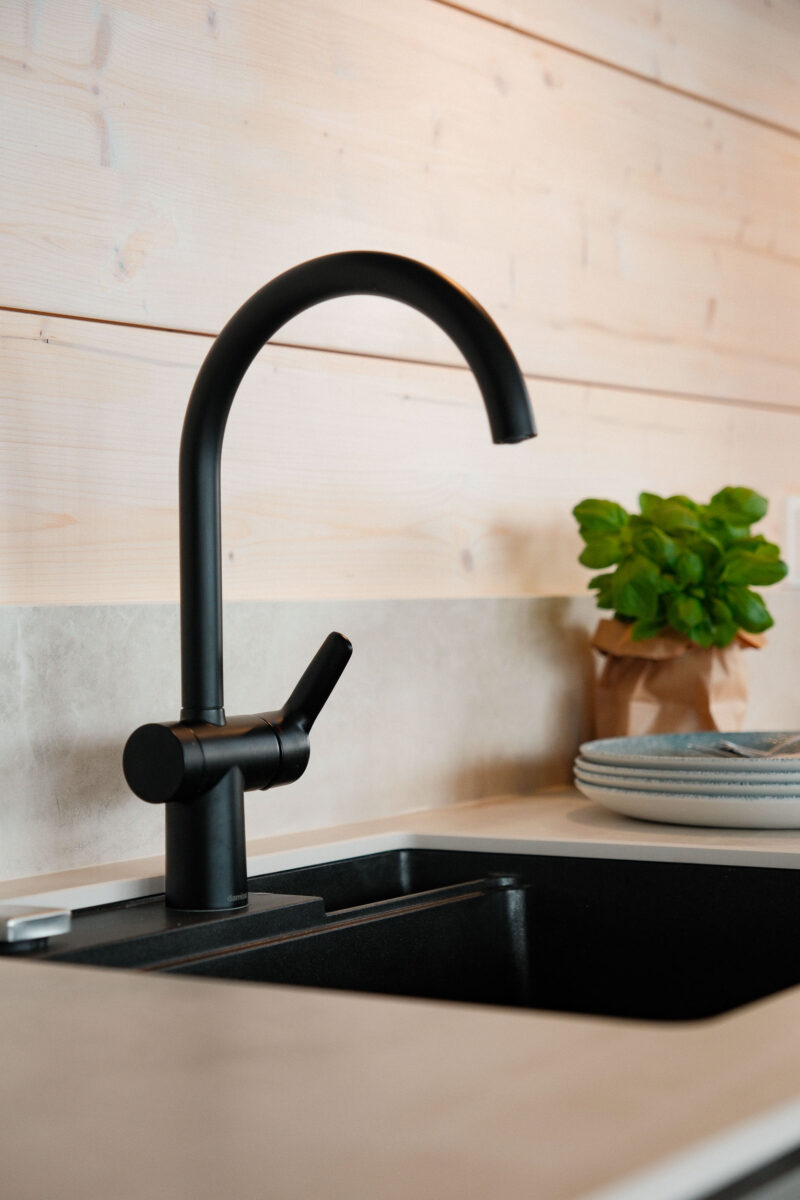 Musta hana tuo tyylikästä kontrastia vaaleaan keittiöön.