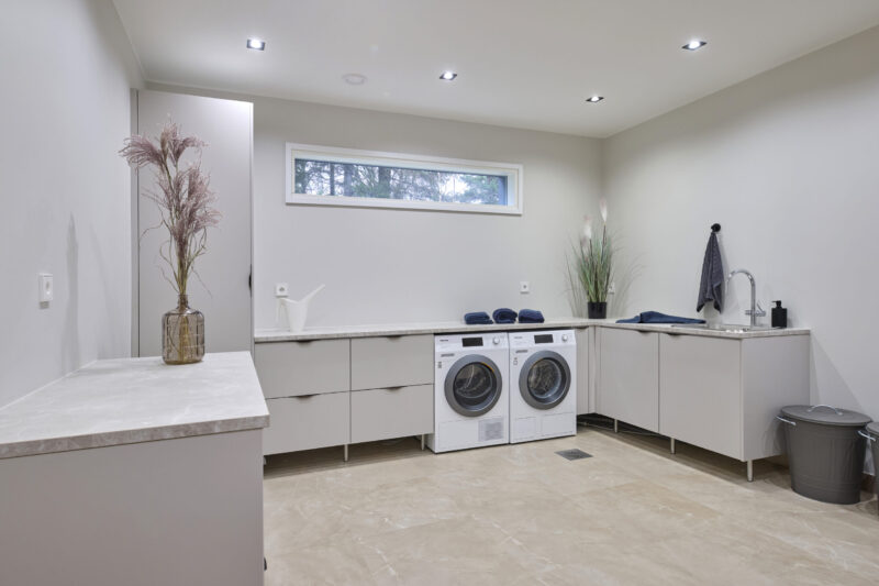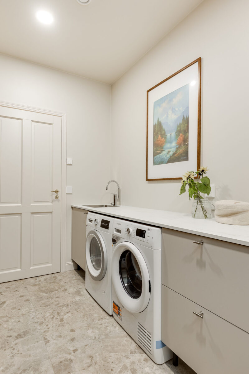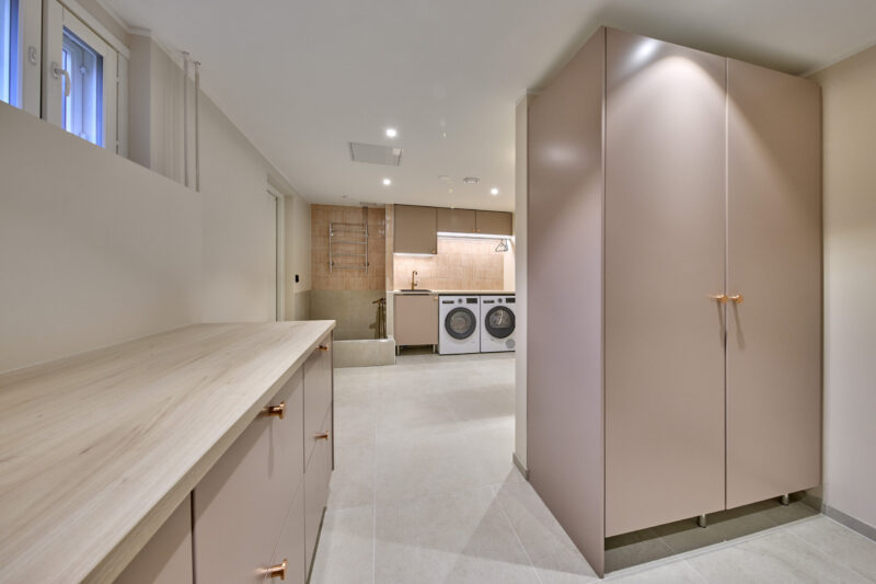 Tässä kodinhoitohuoneessa käytännöllisyys ja harkittu suunnittelu yhdistyvät onnistuneesti. Tila on rakennettu toimivaksi kokonaisuudeksi, jossa jokainen neliö on hyödynnetty tehokkaasti – ilman että tyylistä on tingitty.