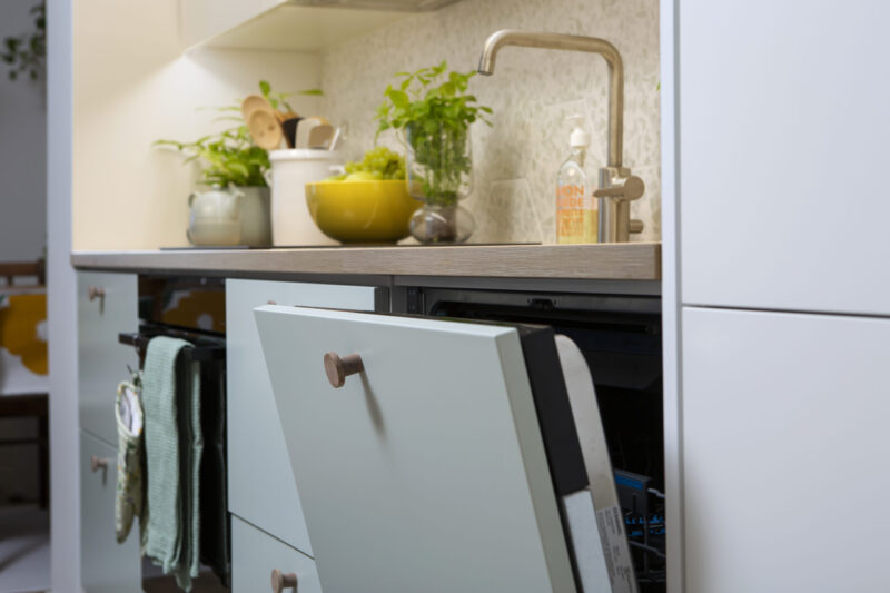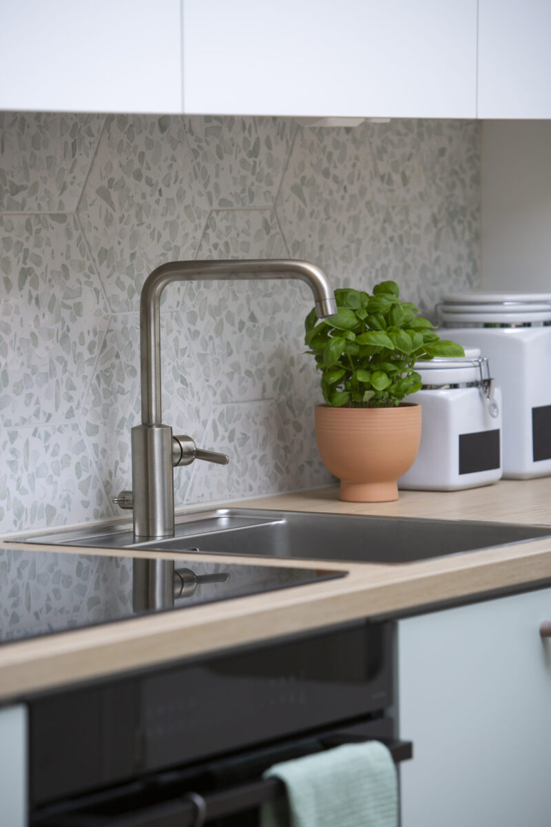 Tässä raikkaassa ja valoisassa keittiössä on leikitelty rohkeasti erivärisillä ovilla. Asiakkaan toiveena oli tuoda tilaan vihreää kaapistoa, mutta säilyttää kokonaisuus rauhallisena: osa ovista toteutettiin vihreinä ja osa neutraalimmissa sävyissä. Lopputuloksena on ihastuttavan ilmava ja harmoninen keittiö, jossa toiminnallisuus on mietitty huolella arjen sujuvuutta ajatellen. Tässä keittiössä persoonallinen ilme ja käytännöllisyys yhdistyy tyylikkäästi