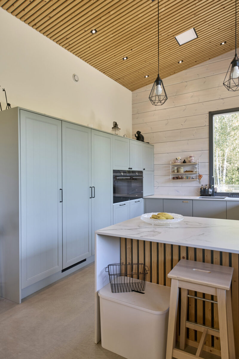 Suunnittelu onnistui erittäin hyvin. Korkeat kaapit ja saarekkeen säleikön taakse piilotettu säilytystila ovat olleet ihan huippuja. Niihin mahtuu todella paljon tavaraa, ja arki pysyy paremmin järjestyksessä. Meillä on iso perhe, joten keittiön suunnitteluun ja kokoon kannatti oikeasti panostaa. Nyt voin rehellisesti sanoa, että meillä on juuri sellainen keittiö kuin haluttiin!