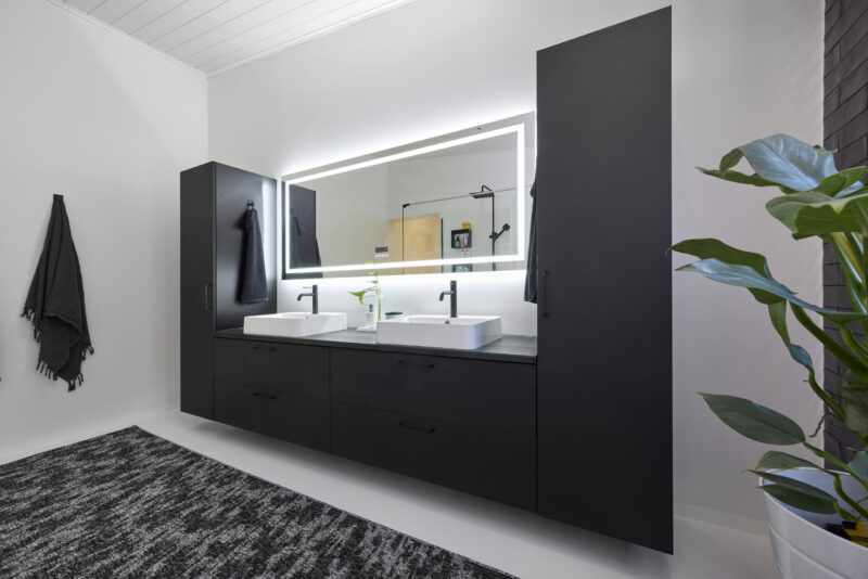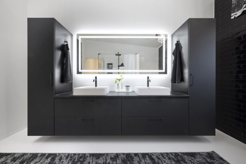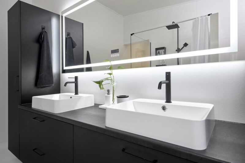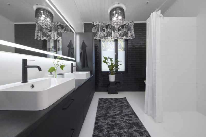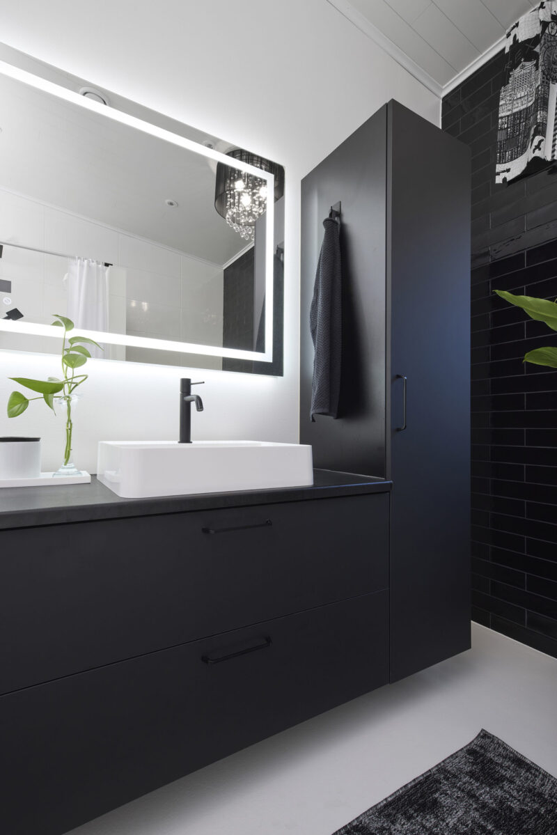 Tumma ja elegantti kylpyhuone huokuu arjen luksusta ja rauhallista tunnelmaa. Kaksi allasta tuo sujuvuutta yhteiseen arkeen, ja suuret vetolaatikot tarjoavat runsaasti säilytystilaa pitäen pinnat siisteinä. Kokonaisuuden kruunaa kauniisti valaiseva valopeili, joka tuo tilaan pehmeää valoa ja viimeisteltyä ilmettä. Lopputuloksena on kylpyhuone, jossa yhdistyvät näyttävyys, toimivuus ja arjen pienet luksushetket.